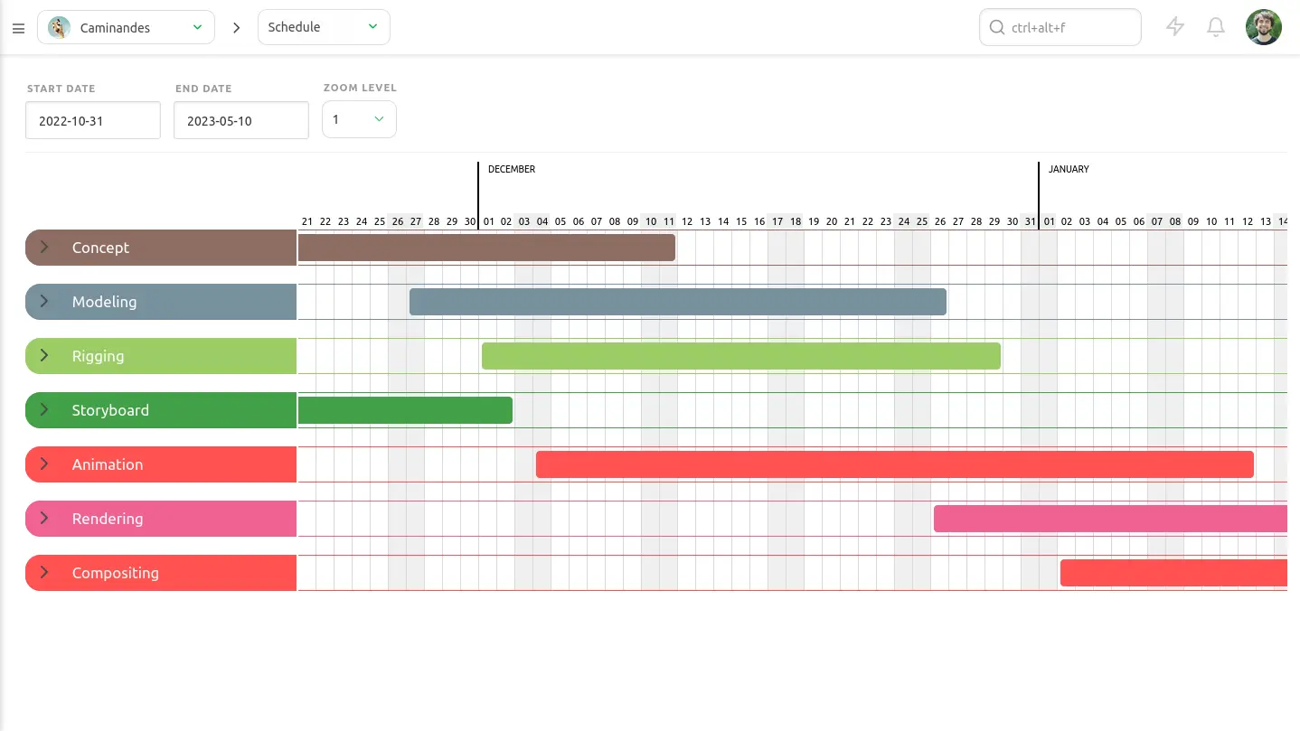In the schedule module, you can set the main duration and milestones of your project. This allows you to see resource allocation and plan your production more effectively.